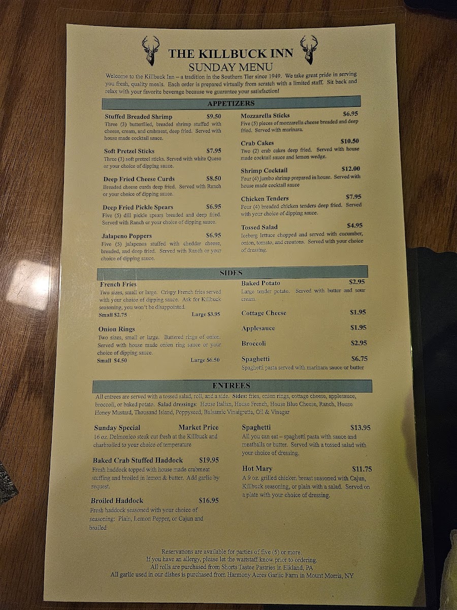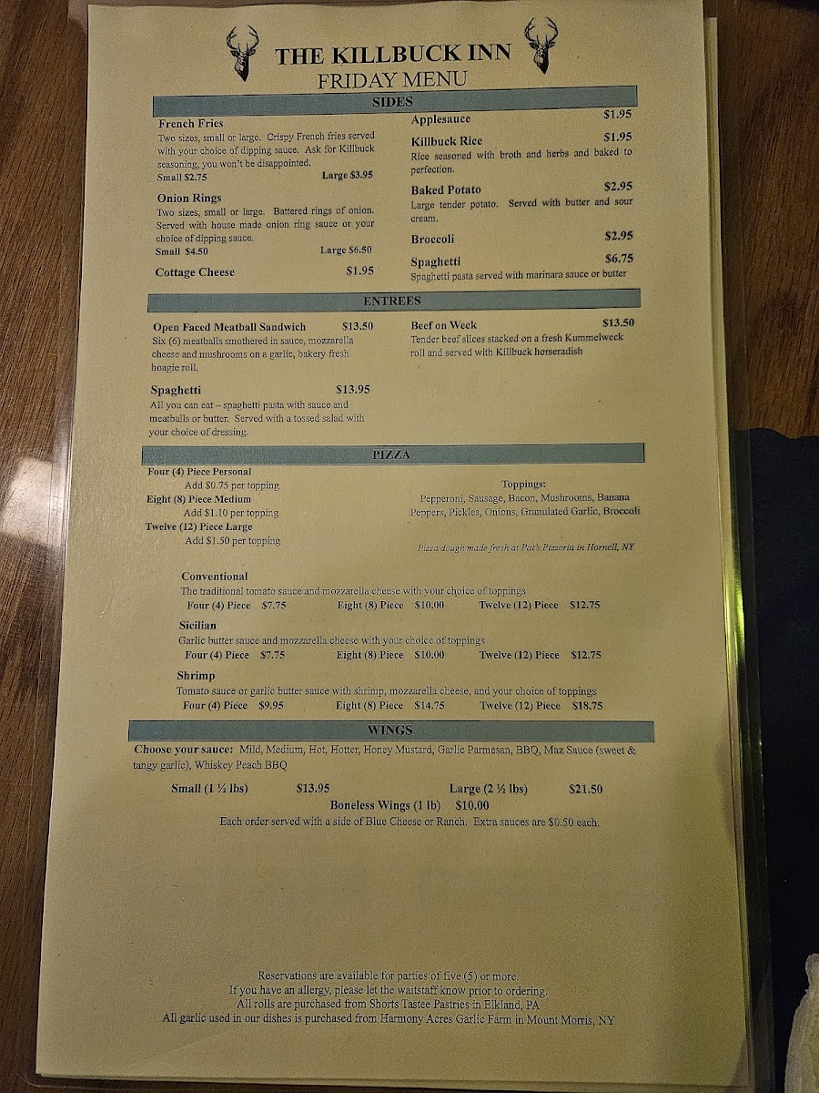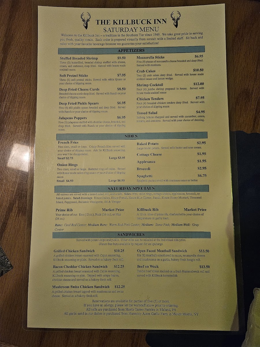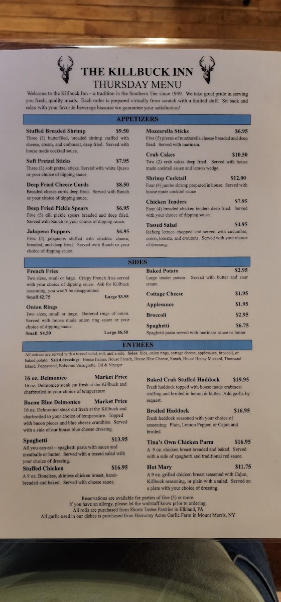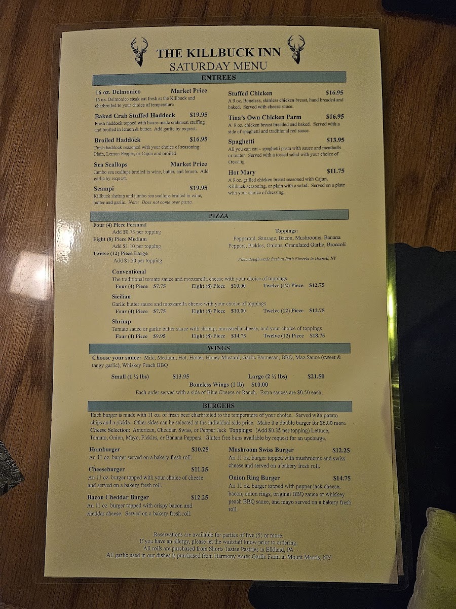 Tucked along NY-36 in Canisteo, the Killbuck Inn Menu brings together that small-town warmth with hearty, satisfying flavors that keep people coming back. It’s the kind of place where comfort food meets easy conversation - think juicy burgers stacked tall, crispy wings tossed in your favorite sauce, and perfectly grilled steaks that hit the spot after a long day. You’ll also find homestyle specials that change with the seasons, each one made to taste just right without overcomplicating things. Whether you’re grabbing lunch with friends or winding down with a pint at dinner, there’s always something inviting on the plate. The laid-back setting matches the food’s honest simplicity, making it a go-to stop for anyone passing through 4900 NY-36 or locals looking for that familiar, satisfying bite.
