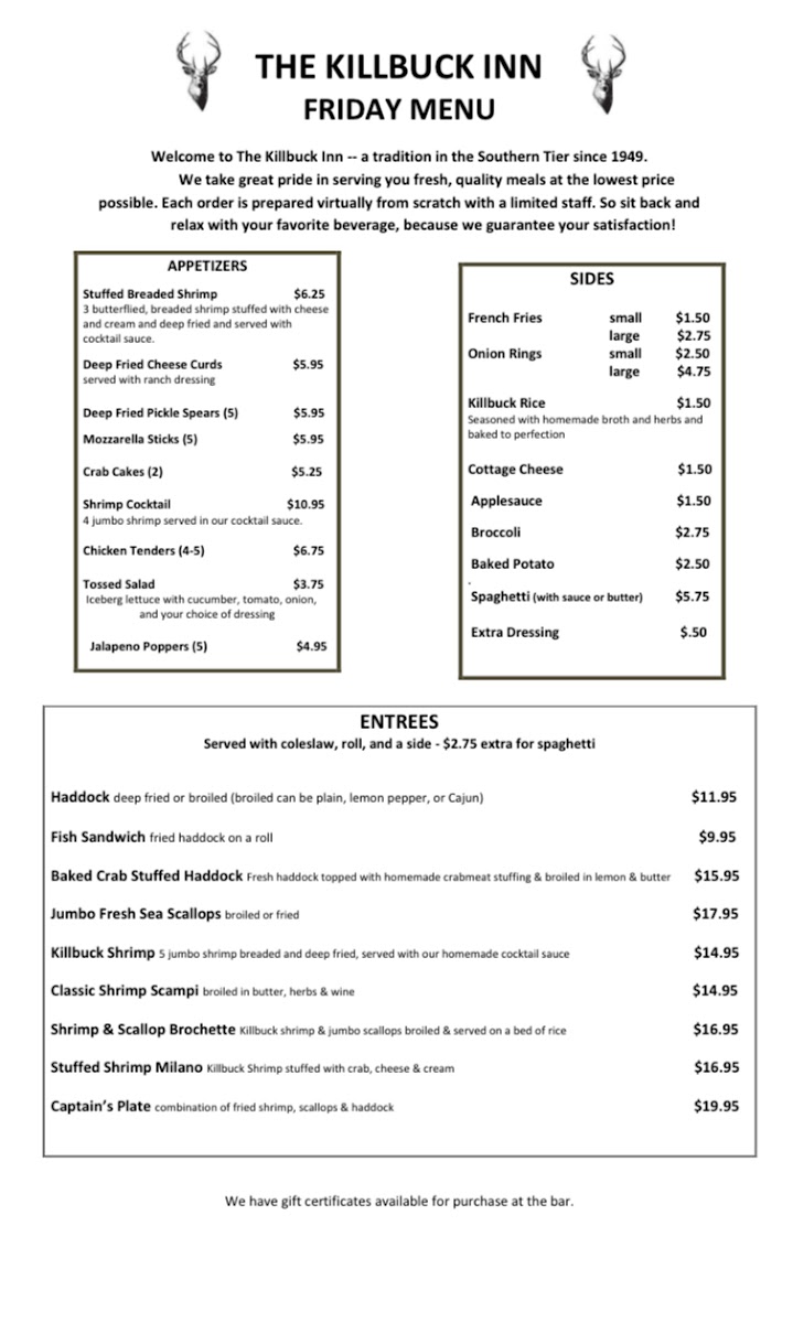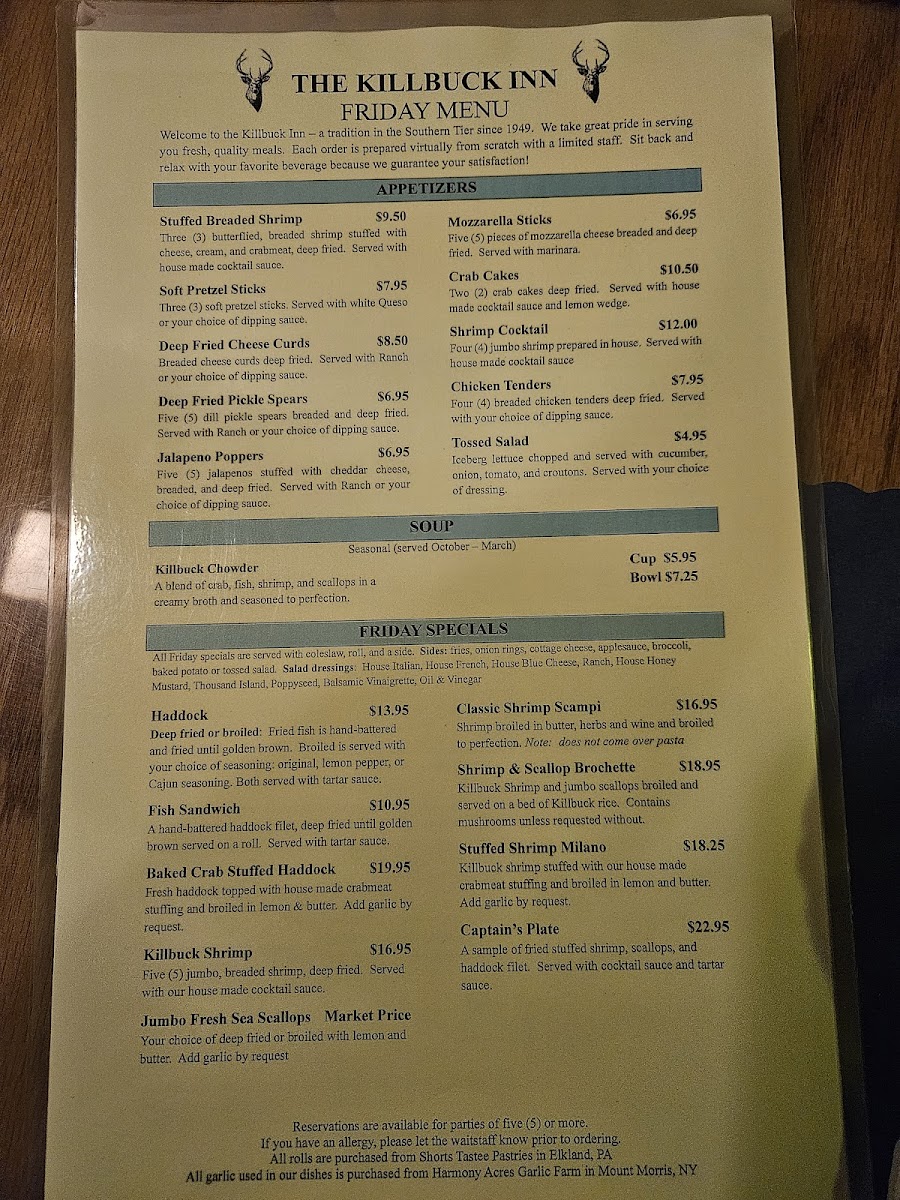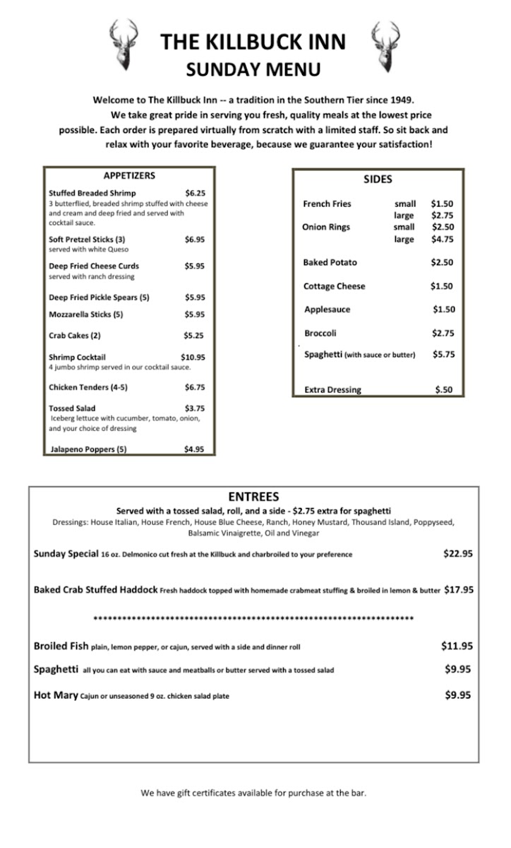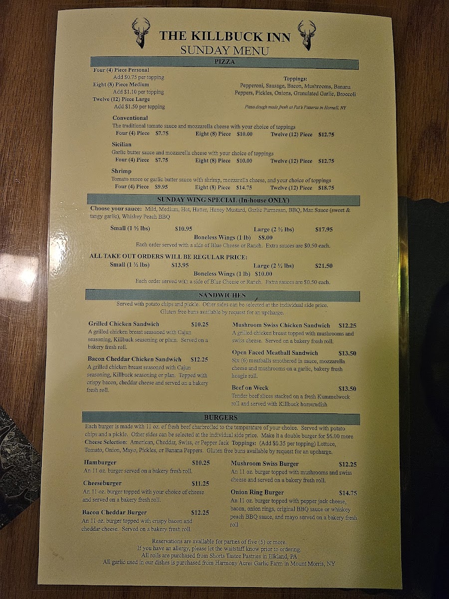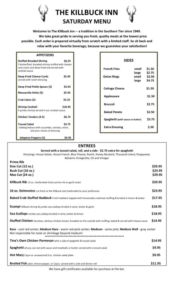 Tucked along NY-36 in Canisteo, the Killbuck Inn Menu brings together that small-town warmth with hearty, satisfying flavors that keep people coming back. It’s the kind of place where comfort food meets easy conversation - think juicy burgers stacked tall, crispy wings tossed in your favorite sauce, and perfectly grilled steaks that hit the spot after a long day. You’ll also find homestyle specials that change with the seasons, each one made to taste just right without overcomplicating things. Whether you’re grabbing lunch with friends or winding down with a pint at dinner, there’s always something inviting on the plate. The laid-back setting matches the food’s honest simplicity, making it a go-to stop for anyone passing through 4900 NY-36 or locals looking for that familiar, satisfying bite.